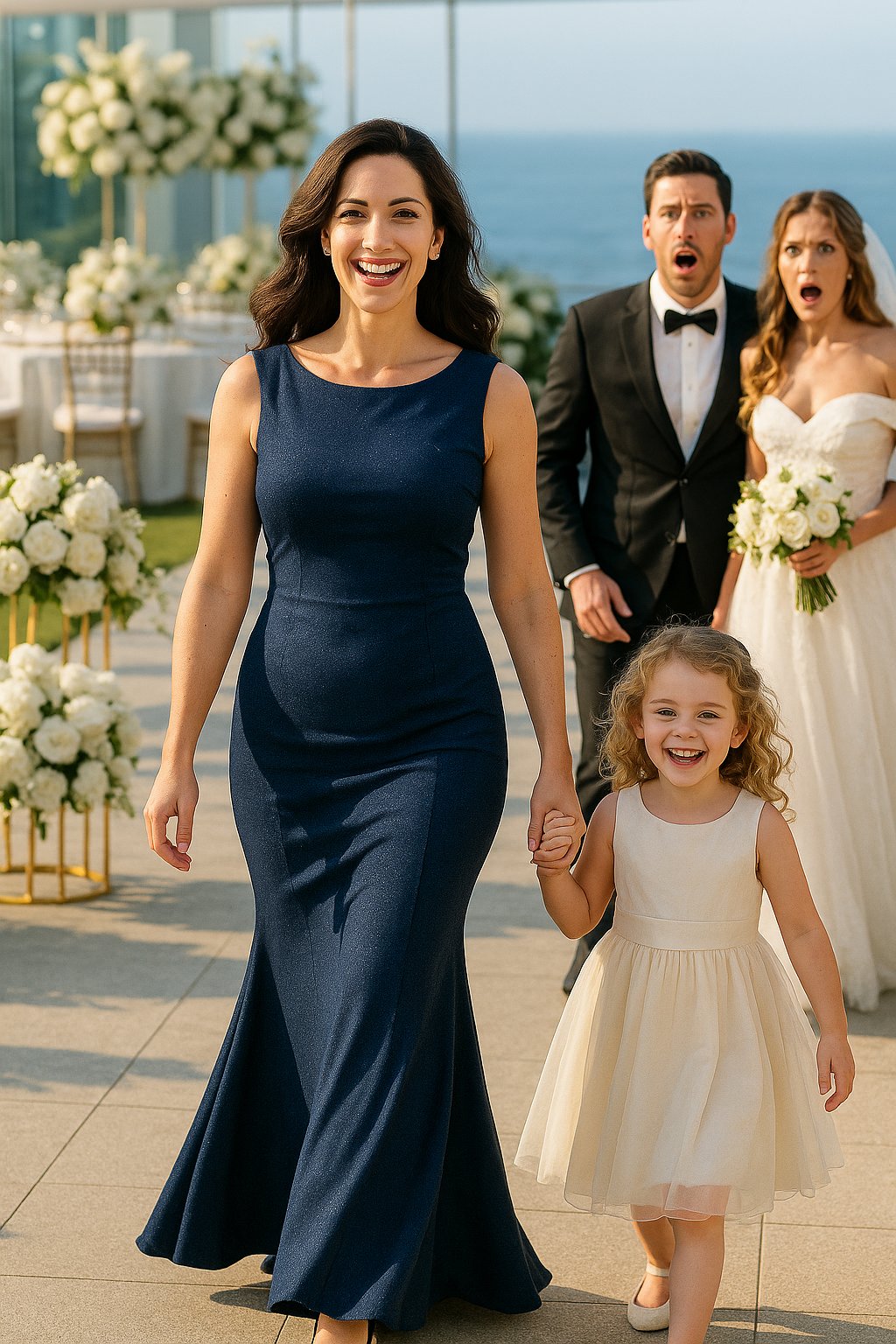 Le jour du mariage, Camille fit une apparition aussi élégante qu’inattendue. Robe bleu marine, posture altière, regard apaisé… elle dégageait une confiance nouvelle. Mais ce qui stupéfia l’assemblée, ce fut la petite fille qui tenait sa main. Quatre ans à peine, des boucles blondes, des yeux noisette… et une ressemblance troublante avec quelqu’un de très familier.