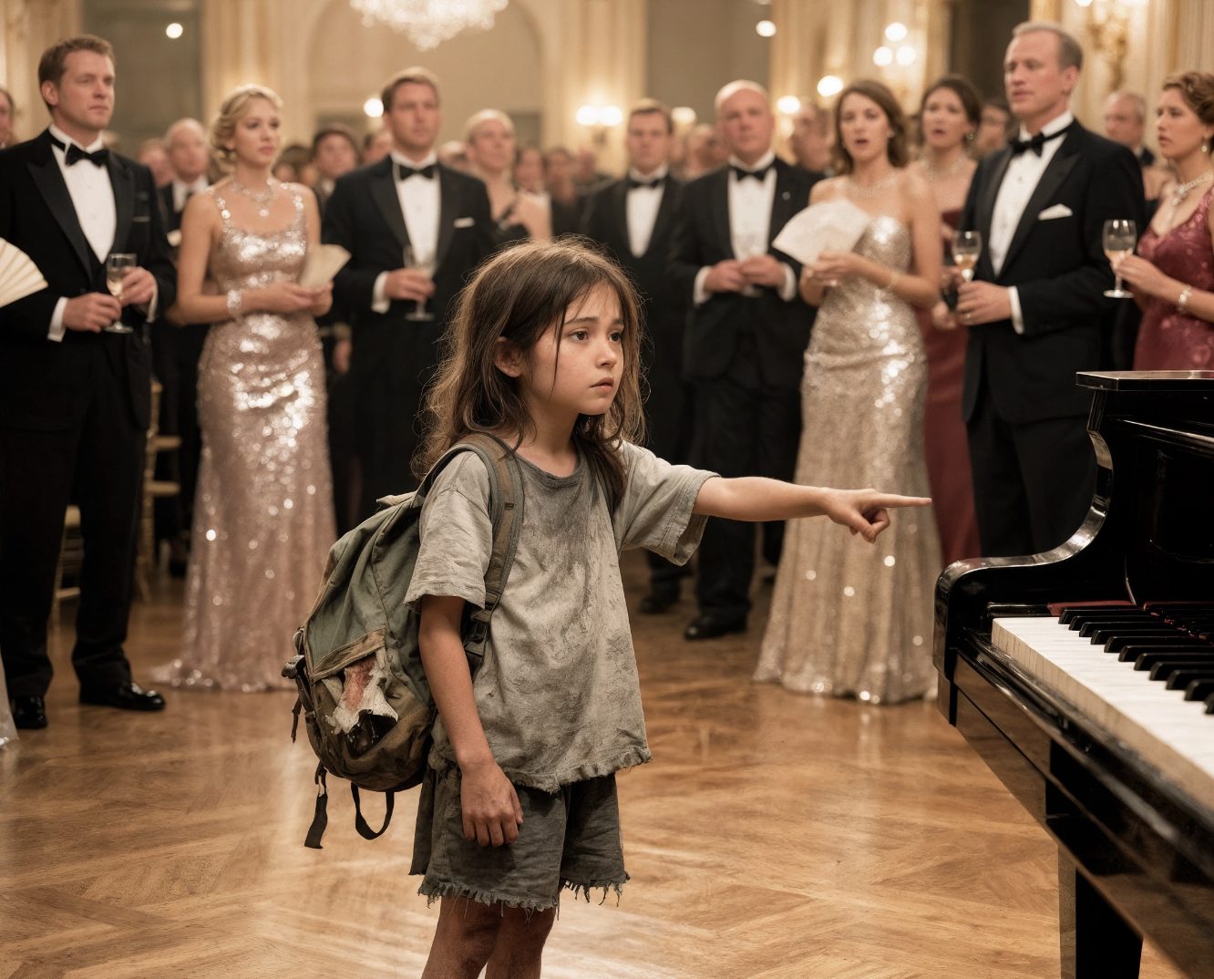 Ce soir-là, poussée par la faim, Camille suivit l’odeur d’un banquet jusqu’à l’hôtel. Pieds nus, vêtue de haillons, elle s’approcha timidement des portes, fascinée par le piano à queue trônant au centre de la salle.