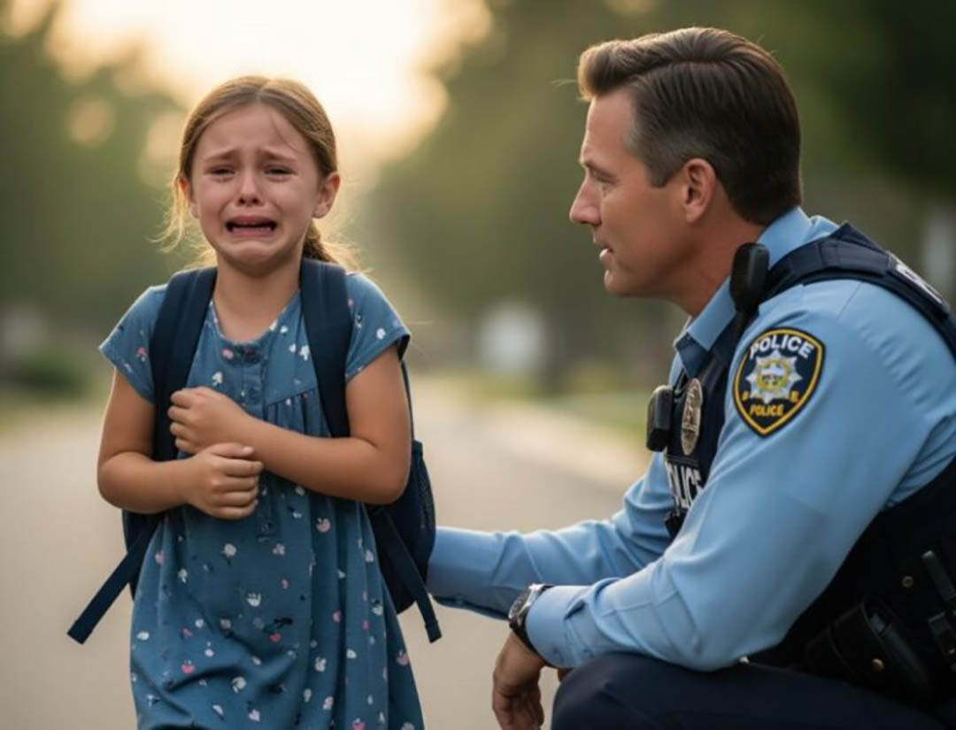 Après avoir traversé plusieurs rues, elle aperçoit enfin deux policiers en patrouille. Sans attendre, elle se dirige droit vers eux. L’officier perçoit immédiatement son état : cette petite fille seule, visiblement bouleversée, n’est pas là par hasard. Il s’approche avec douceur, mais l’enfant éclate en sanglots et se réfugie contre lui.