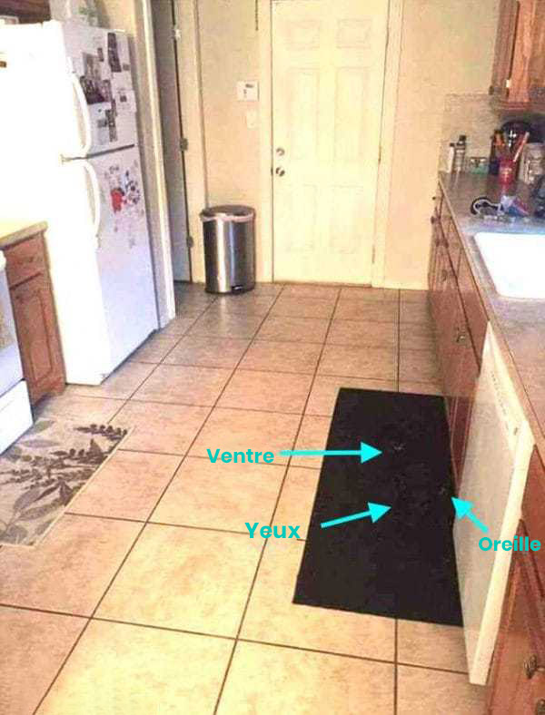 Bienvenue dans le domaine fascinant de la perception gestaltiste : notre cerveau perçoit d’abord le tout avant les détails. Dans cette scène, il interprète une cuisine ordonnée et homogène, et tout ce qui s’intègre au grand aplat sombre est perçu comme faisant partie du tapis. Ce même phénomène peut nous faire manquer un ami portant un manteau noir dans une foule à la sortie du métro : notre cerveau cherche la cohérence globale plutôt que les anomalies.