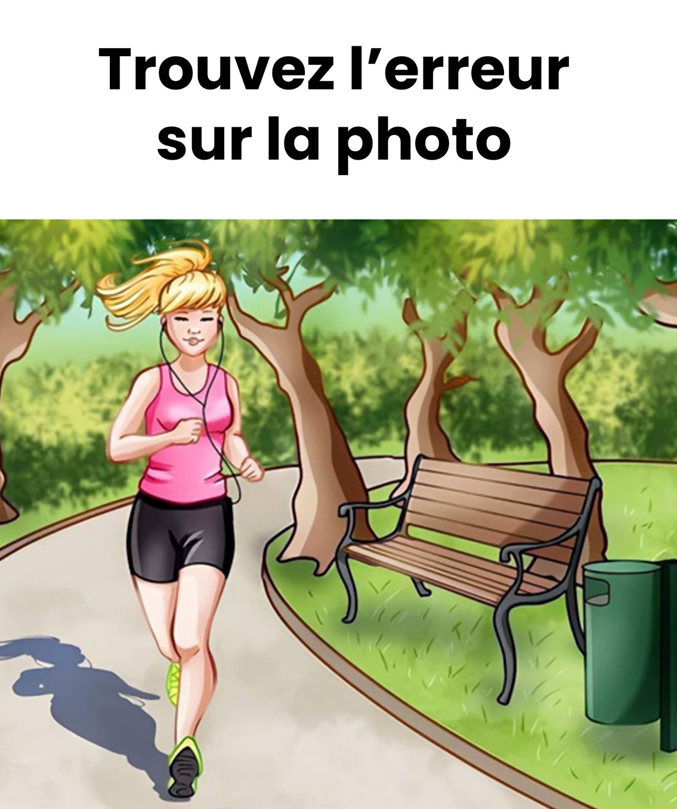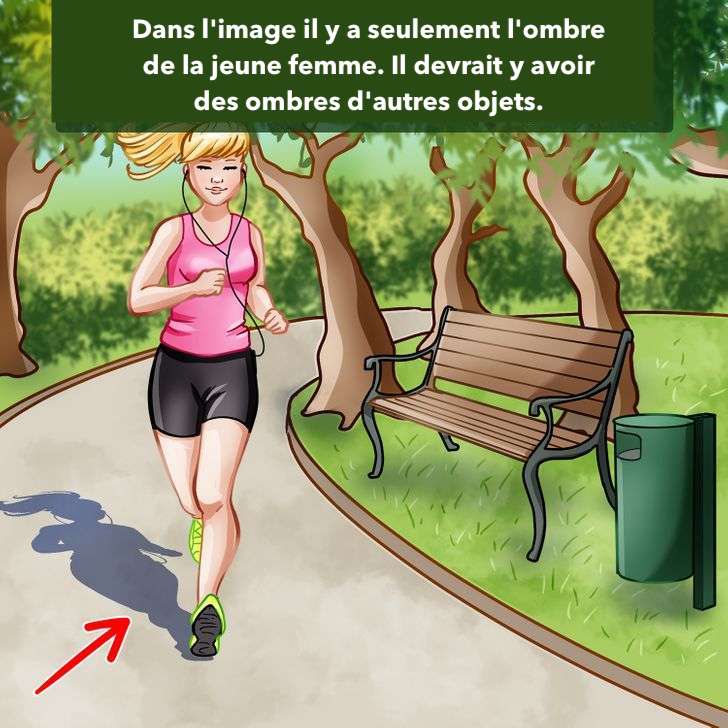 Sur l’image, seule la joggeuse porte une ombre. Pourtant, les arbres, les bancs et les autres composants du décor devraient normalement en projeter également.