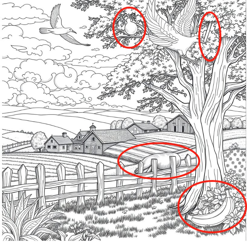 À première vue, c’est une scène bucolique, paisible, typique d’une vie à la campagne : une maison en bois, une grange rouge, un jardin fleuri et des arbres fruitiers baignés de soleil. Mais derrière ce décor tranquille se cache un défi : saurez-vous repérer une poire, un crayon, un ours et une banane dissimulés dans le paysage ?