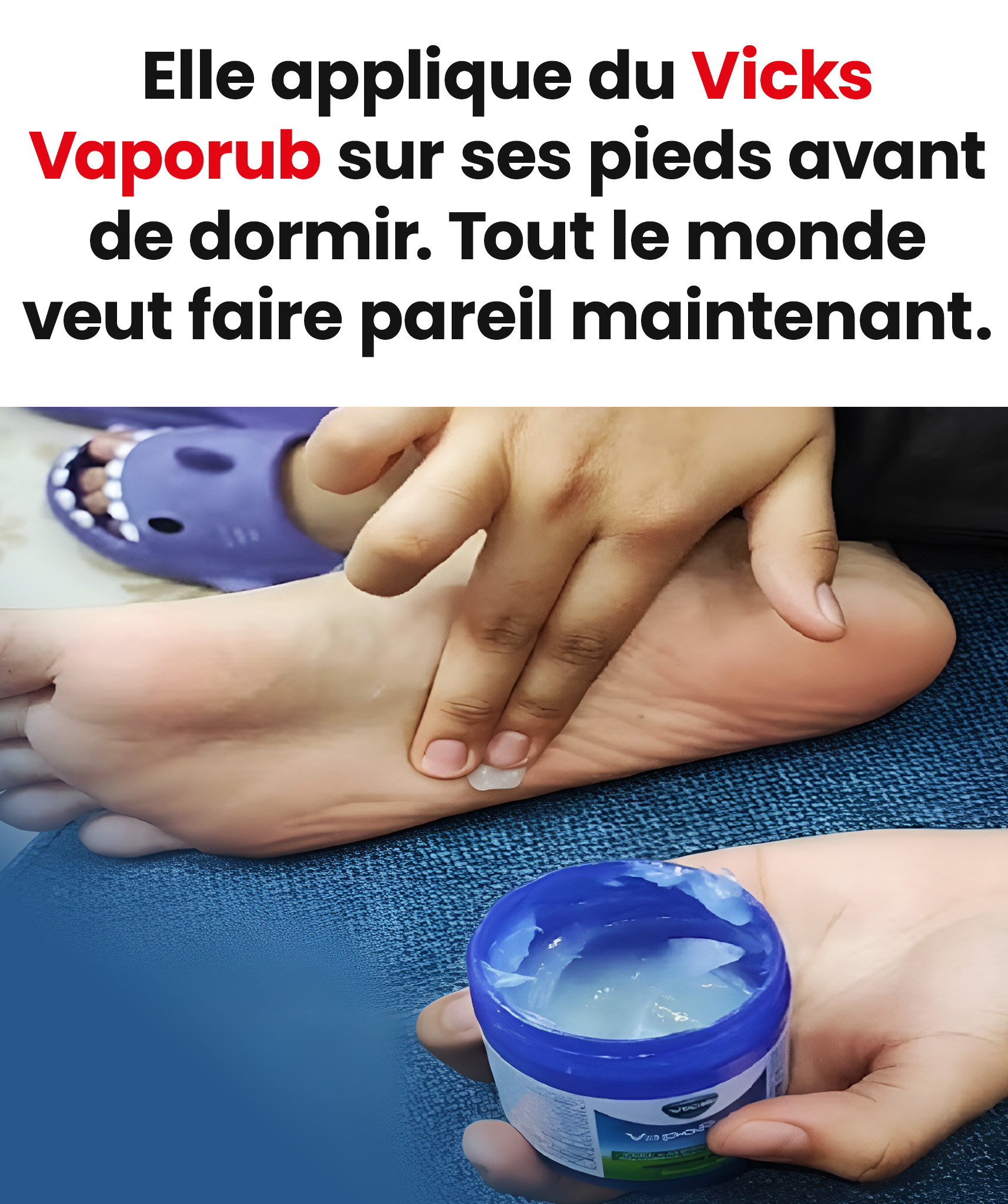 Avant de vous coucher, appliquez généreusement le Vicks sur vos pieds, enfilez des chaussettes en coton et laissez le produit agir jusqu’au matin. Au réveil, vos pieds paraissent plus doux, mieux hydratés et visiblement en meilleure santé. Un soin beauté économique à intégrer à votre routine du soir !