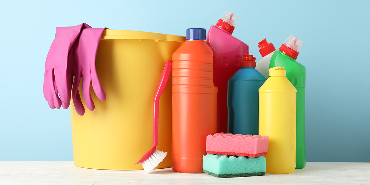 Bucket, bottles with detergent and cleaning supplies on blue background, space for text