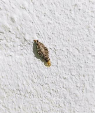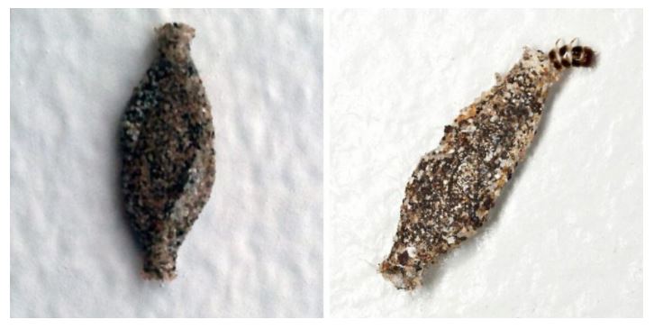 Leur cocon fuselé, souvent mêlé de poussière, est généralement le premier signe visible. On peut parfois en trouver plusieurs regroupés dans un endroit calme où l’air circule peu.