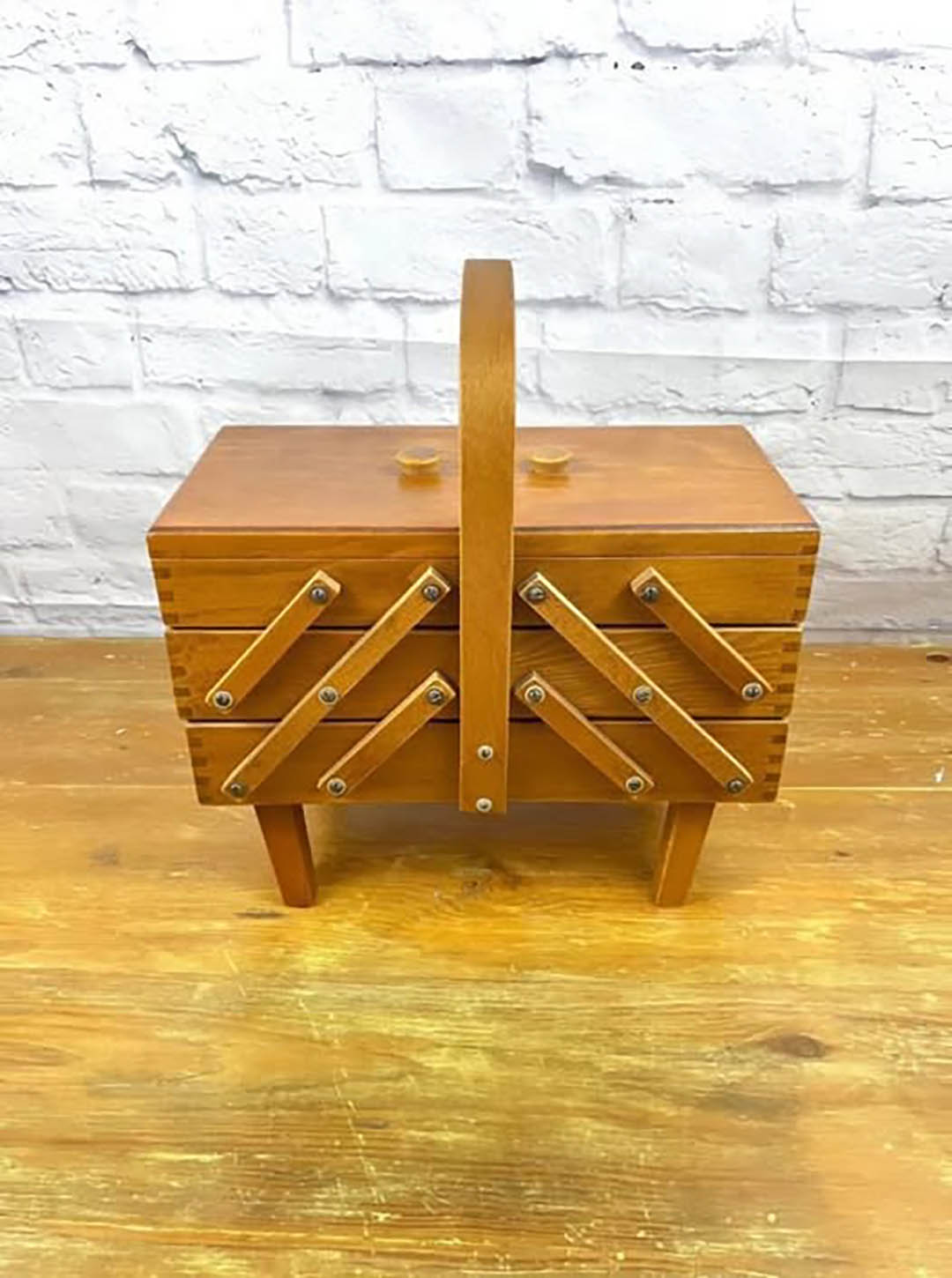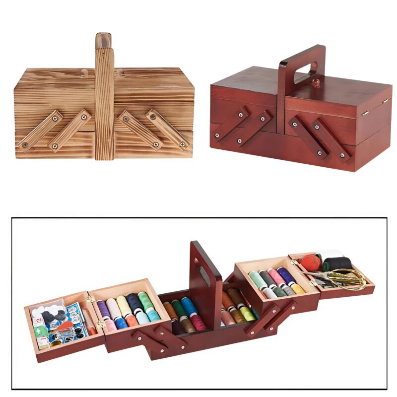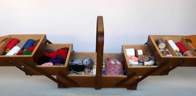 Il s’agissait en réalité d’une ancienne boîte de couture ancienne, un accessoire autrefois fondamental dans la vie domestique. À une époque où l’on reprisait, ajustait et personnalisait ses propres habits, un tel objet était le compagnon indispensable de nombreuses journées. Chaque alvéole était destinée à un outil spécifique : bobines de fil, écheveaux, aiguilles, boutons minutieusement classés. C’était un petit univers d’ordre et de savoir-faire artisanal.